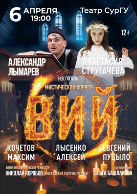 Пожалуй, самая сенсационная премьера сезона — постановка легендарной повести «Вий» Н.В. Гоголя. Первое произведение, в котором на фоне настоящих мистических ужасов происходит борьба света и тьмы, добра и зла. Инсценировка сделана с огромным почтением и любовью к Н.В. Гоголю, и при этом спектакль – не скучный пересказ великой повести классика, а энергичная постановка в стиле хоррор с пластикой и танцами, спецэффектами.