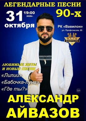 Погрузитесь в атмосферу легендарных 90-х!!! Александр Айвазов — голос, знакомый миллионам, исполнит свои главные хиты, которые звучали в каждом доме и до сих пор трогают сердца.